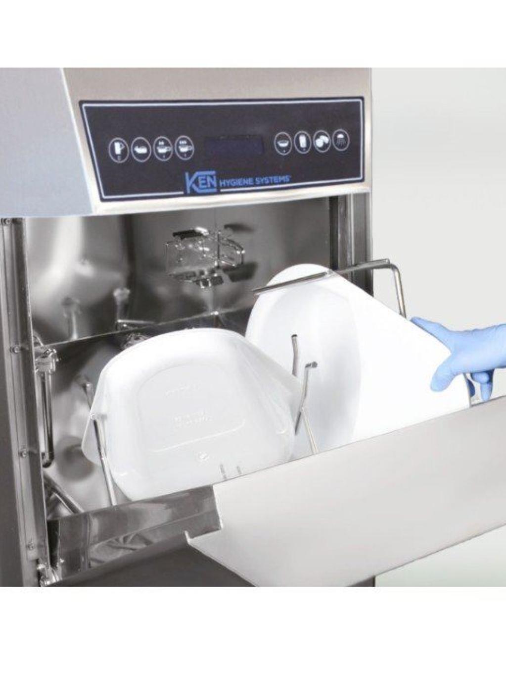 Trotz der Tiefe von nur 46 cm ist der Beckenspüler überaus geräumig. Das umfassende Zubehörprogramm bietet zahlreiche Kombinationsmöglichkeiten, die Flexibilität und Benutzerfreundlichkeit erhöhen.